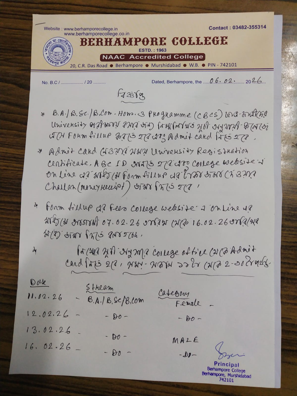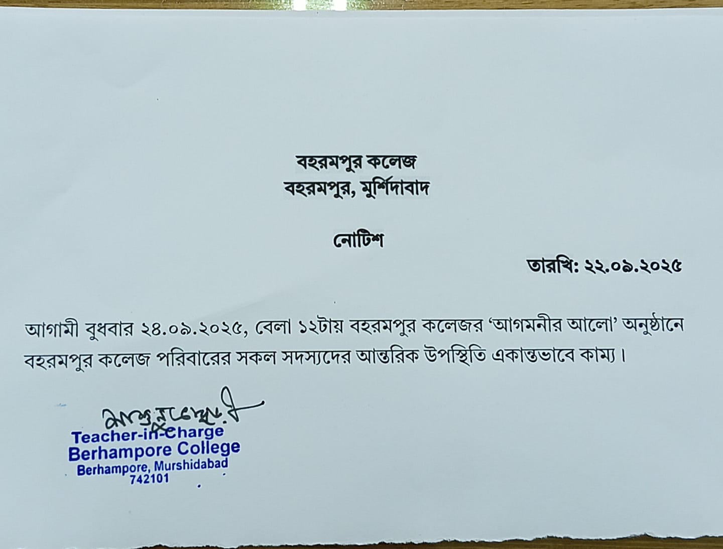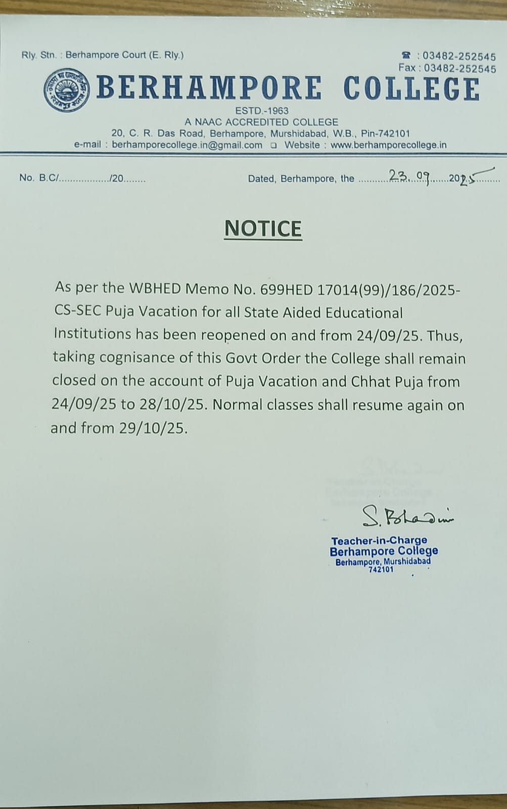 Nestled at the heart of Murshidabad District, Berhampore College, has a proud history of inspiring and helping students since its foundation in 1963. Initially started as Raja Krishnath College of Commerce, the college was renamed in 1975 owing to the introduction of Arts Stream in collaboration with Calcutta University and the Government of West Bengal. Today, Berhampore College includes courses in Humanities, Commerce and Science Streams offering undergraduate degrees in Bengali, English, Philosophy, History, Geography, Film Studies, Commerce, Economics, Sanskrit, Mathematics, and Statistics to accommodate the needs of its varied and diverse student demographic. Affiliated with UGC under 2f and 12B, this NAAC accredited college has, in the recent years, under the able leadership of its esteemed TIC, Dr. Santanu Bhaduri, prioritized its commitment to education through innovative classroom learning.