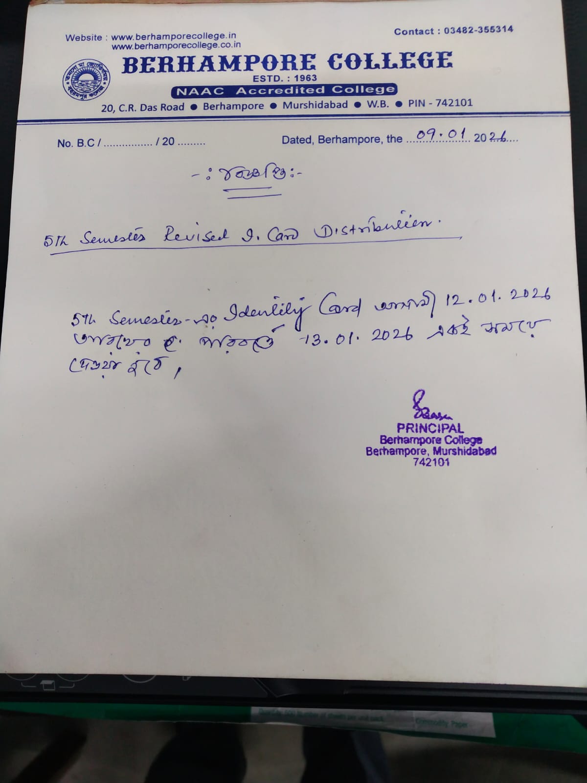| 1 | 09 Jan 2026 | New 5th Sem Revised Id Card Distribution Notice | Download |
