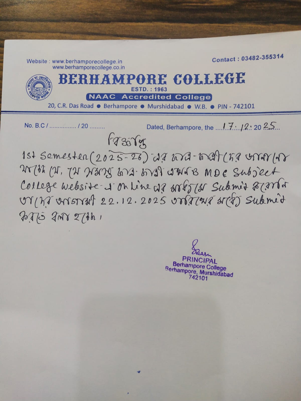 Nestled at the heart of Murshidabad District, Berhampore College, has a proud history of inspiring and helping students since its foundation in 1963. Initially started as Raja Krishnath College of Commerce, the college was renamed in 1975 owing to the introduction of Arts Stream in collaboration with Calcutta University and the Government of West Bengal. Today, Berhampore College includes courses in Humanities, Commerce and Science Streams offering undergraduate degrees in Bengali, English, Philosophy, History, Geography, Film Studies, Commerce, Economics, Sanskrit, Mathematics, and Statistics to accommodate the needs of its varied and diverse student demographic. Affiliated with UGC under 2f and 12B, this NAAC accredited college has, in the recent years, under the able leadership of its esteemed TIC, Dr. Santanu Bhaduri, prioritized its commitment to education through innovative classroom learning.