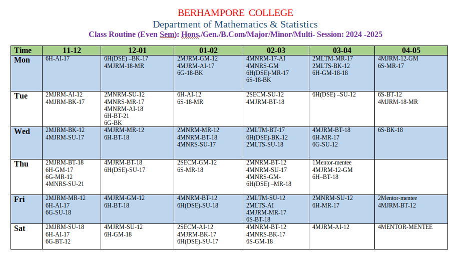 | 3 td > | 15 Jan 2025 | Mathematics, Class routine, Session 2024-25, Even Semester | Download |