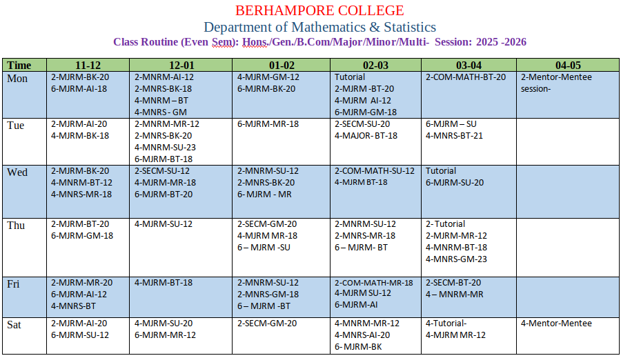 | 1 td > | 28 Feb 2026 | Mathematics, Class routine, Session 2025-26, Even Semester | Download |